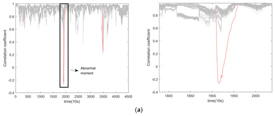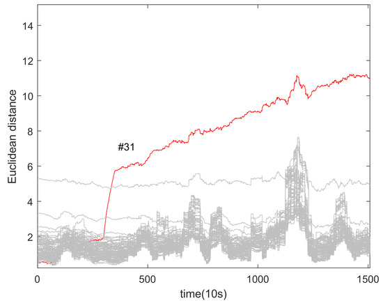 Figure 9 shows the voltage variation curve for each battery cell in the battery pack during the electric vehicle’s operation. The curve represents 96 battery cells connected in series. The gray curve represents the voltage of normal, fault-free battery cells, while the red curve represents the voltage of cells experiencing a fault. From Figure 9, it is evident that battery cell #12 in car 1′s battery pack and battery cell #31 in car 2 both experienced early internal short-circuit faults. It is worth noting that the voltage variation curves exhibit random perturbations under actual operating conditions, which could potentially impact the accuracy of the fault identification method.