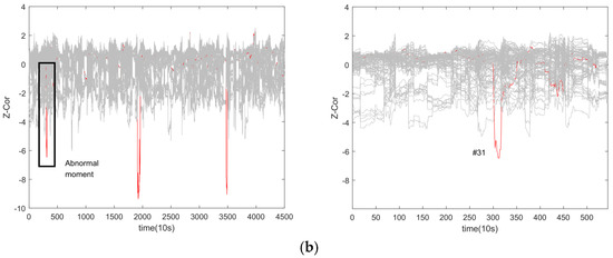 Both Figure 11 and Figure 12 contain curves of the original computed results as well as curves of the results after Z-score processing. The curves in red are known as faulty cell curves. Figure 11 depicts the results obtained from the cosine similarity method applied to car 2. The outcomes reveal that this method effectively differentiates faulty battery singletons between the 300th and 350th sampling points despite significant differences being observed. In contrast, Figure 10a shows that a single threshold value fails to trigger the threshold alarm for the faulty battery monomer #31.