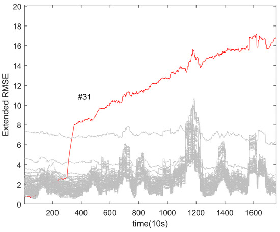 Figure 13 and Figure 14 demonstrate the use of the extended RMSE method and the Euclidean metric on car 2, respectively. These methods are both distance-based, resulting in a similar overall trend in the calculated results. However, the extended RMSE method is more sensitive to faults due to its tolerance parameter settings, which leads to higher calculated values for faulty cells. Like the cosine similarity method, the distance-based method can identify faulty cells by using a single threshold at the 350th sampling point.