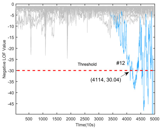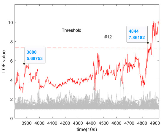 After converting the above fault characteristic indicators, the results of the LOF algorithm are used to calculate the abnormalities in car 1 and car 2. These results can be seen in Figure 15 and Figure 16. For the LOF algorithm, the proximity point parameter is set to 10. In Figure 15, the red dashed line represents the fault threshold, while the red curve represents the LOF value curve of battery #31, which is the faulty battery. By using the threshold value, the single cell of battery #31 in car 2 can be correctly triggered at the 318th sampling point. In Figure 16, the LOF value curve for battery #12 correctly triggers the threshold at the 4844th sampling point, indicating an alarm. To avoid inconsistencies in threshold adjustment across different cars, the outlier threshold value is uniformly set at 7.5. This allows batteries with slightly less consistency to avoid falsely triggering the threshold. Typically, a certain number of fault data points are used as training objects to set thresholds and meet the requirements of various application scenarios. In this study, car 2 was used to provide training data for the threshold adjustment, while car 1 was used to provide test data to verify the feasibility of the threshold setting. Results from real car data demonstrate that this method can be appropriately applied across different cars.