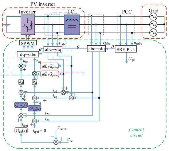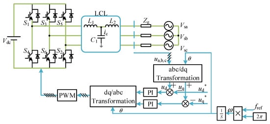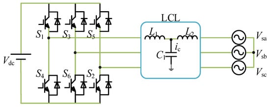 Inverters play an important role in grid-connected PV systems. The dc side voltage of the inverter is generally provided by a pre-stage boost converter with a constant output voltage Vdc. Based on the dc voltage, the inverter converts dc power into ac and connects with the public grid via an LCL filter [26], as shown in Figure 2.