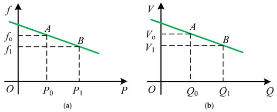 Droop control is implemented in PV inverters by simulating the droop characteristics of the synchronous generator in a conventional power system [43,44]. Figure 7 shows the droop curves, by which the system can regulate and distribute the active power via P/f droop and the reactive power via Q/V droop. Taking the P/f droop as an example, as the load increases, the operating point shifts from point A to point B from the droop curves. Figure 7a shows that system frequency declines and more power is output for loads [45].