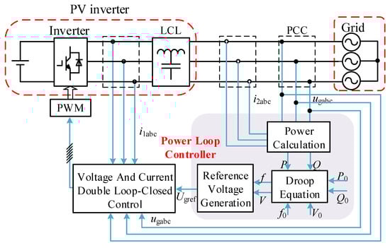 The grid-connected inverter system with droop control is shown in Figure 8 [46]. The amplitude and frequency of inverter output voltage are derived using the droop curves illustrated in Figure 8. The closed-loop voltage and current control are used to improve the system’s dynamic performance [47]. In general, droop control works as the first stage of system power and frequency regulation. It cannot realize zero error control because of the constant droop curve [48]. Therefore, implementing secondary control by redesigning the droop curve to change its equilibrium points is necessary [49]. For instance, in the P/f droop curve, the system frequency reduces when output power rises. Only if the output power is the rated reference power can the frequency be stabilized at the reference point. Therefore, the power reference should be controlled to adapt for the rated frequency point by secondary control.