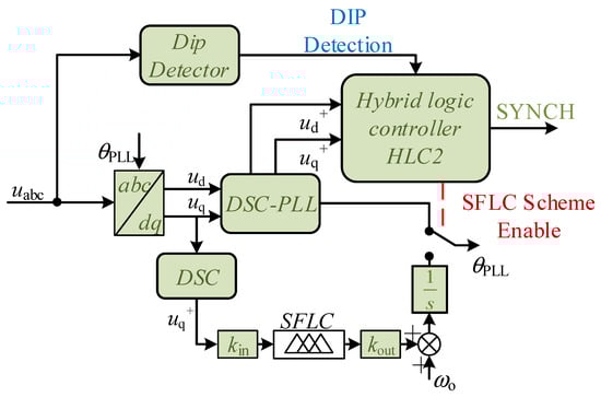 FLC can be employed directly within the current and voltage control without being combined with traditional controllers, but directly substituting PI and PR controllers [63,64] introduced FLC into the synchronous control part to improve the synchronization stability of inverters. The implementation is shown in Figure 10. A hybrid scheme is formed by combining fuzzy control with conventional PI control in phase-locked loop. The difference is that this FLC is not designed to regulate PI parameters but works as an independent controller to control the system directly. The delayed signal cancellation (DSC) is a pre-filter that extracts the positive sequence components of the grid voltage [65]. Dip detection enables the single-input fuzzy logic controller (SFLC) in time by monitoring grid voltage dips. The hybrid logic controller (HLC2) enables logic switching between DSC and SFLC. This control scheme can prevent the synchronization instability under voltage dips and significantly increases the inverter synchronization speed. However, the internal mechanism of how fuzzy control increases synchronization stability and the efficiency for complex systems has to be further analyzed and proved.