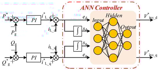 The ANN has four layers in terms of network structure: one input layer, two hidden layers, and one output layer [79]. The input layer contains four inputs, two of which include the error vector edq(k), and the other two include the integration of the error sdq(k), which are respectively defined as: