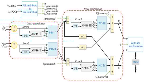 By combining ANFIS with traditional PID controller the adaptive fuzzy neural PID control can be implemented in a PV inverter system to address the issues of system instability and long response times [94,95]. The ANFIS-based PID control in the PV inverter system is given in Figure 13. The membership function and rule base of the fuzzy controller is determined by ANFIS using ANN, and the PID control parameters are modified online [96]. The external loop controls the voltages of the dc bus and the point of common coupling (PCC) to generate the current reference on the d-q axis, which are denoted, respectively, as Id, Iq. By managing the grid-connected current, the internal control loop regulates the system power. There are four ANFISPIDs (ANFIS-based PID controls) in the inner and outer control loops whose outputs are the PID parameters and inputs are the error and error change rate of control objects such as the dc voltage, PCC voltage, and active and reactive currents: