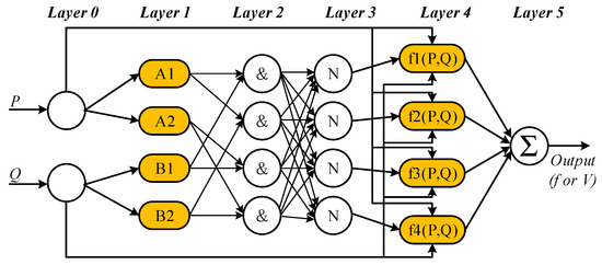 As previously indicated, ANFIS generates input/output mapping using membership functions (MFs) and appropriate input/output (I/O) mappings based on fuzzy if–then rules. The settings of MF can be altered through learning. During this process, the fuzzy rules are modified by appropriate neural network training without any knowledge of membership functions and rules [99]. The configuration of the membership function depends on their parameters, which are automatically selected by ANFIS, and the appropriate I/O data are used to build the FIS. Compared with conventional droop control, the FIS has two inputs: active power (P) and reactive power (Q), and the output is either the frequency (f) or the voltage (V). A typical structure for PV inverters based on ANFIS is shown in Figure 14, Among them, the symbol “&” represents the sum of the input signal, and the symbol “N” represents the ratio of the triggering intensity of the i-th node to the sum of all rule triggering intensities.