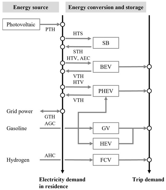 - Higashitani, T.; Ikegami, T.; Akisawa, A. Effect of electric vehicles and bidirectional power supplies on economically optimized energy system configurations of residences. J. Jpn. Soc. Energy Resour. 2022, 43, 140–150. [Google Scholar] [CrossRef]