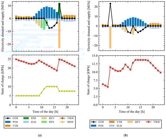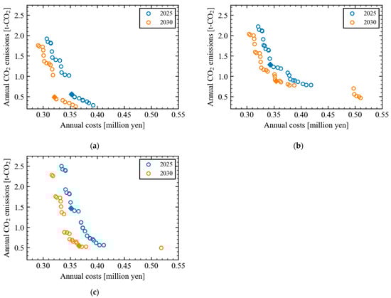 - The optimal technological configuration, considering the balance between annual costs and annual CO2 emissions, varied depending on the vehicle driving patterns. For residences with long parking times, the combination of BEVs and V2H systems was most effective in 2025 and 2030. In contrast, with long times outside the residence, the combination of HEVs and SBs was selected for 2025, and the combination of BEVs, V2H systems, and SBs was selected for 2030. In addition to BEVs, the introduction of SBs has increased the installed PV area and improved energy efficiency.