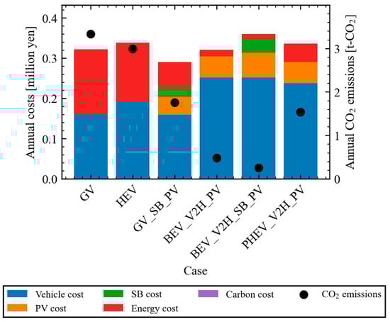 | Minimized annual CO2 emissions | BEV_V2H_SB_PV | 36 | 10 |