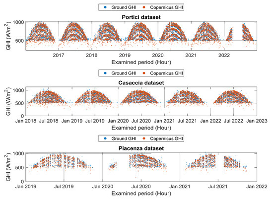 Hourly averaged GHI behavior during the examined period for the three analyzed datasets. Red dots represent Copernicus GHI; blue dots represent Ground GHI. It is worth noting that some periods of missing data exist in each dataset.