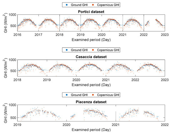 To identify the possible conditions affecting these seasonally different performances, we evaluated the mean bias error. Analyzing the bias error, it could be observed that, in autumn and winter, GHIcop always underestimates GHIground, in both hourly and daily datasets. As a matter of fact, several conditions exist, as listed in the Discussion paragraph, that could result in such a behavior, although none of them seems to be more likely to occur on a seasonal basis. The different atmospheric and environmental conditions typical of these seasons may affect these results. During spring and summer, for example, the reduced presence of clouds could reduce the absorption and scattering of solar radiation, improving the accuracy of satellite estimates and contributing to lower MREs. During autumn and winter, the increased presence of rains could increase the difficulties in accurately measuring solar radiation, contributing to worse performance indicators. Such conditions are, however, poorly correlated with seasonal variance, as discussed above. We therefore suggest that the observed effect can be more substantially correlated with the elevation of the sun, resulting in less noisy measurements being obtained for higher elevation angles. In any case, the obtained results suggest the feasibility of using Copernicus GHI as an alternative to ground data, as well as its use as an alternative to hourly and daily averaged data.