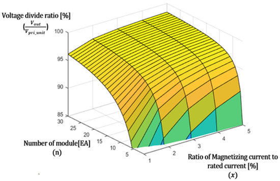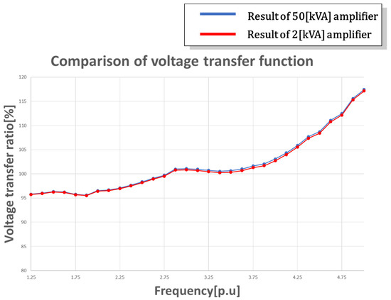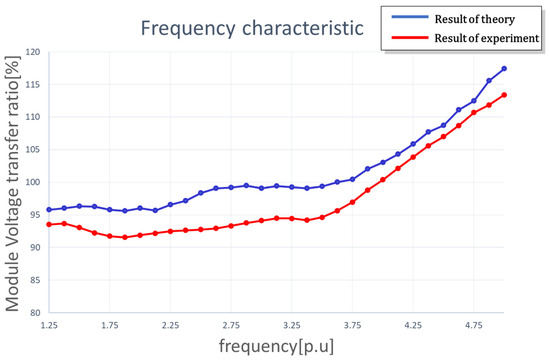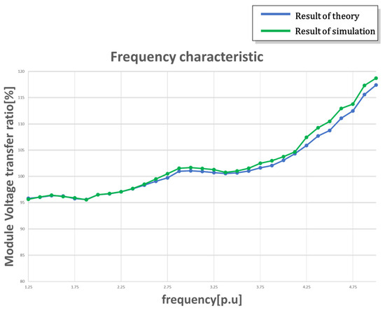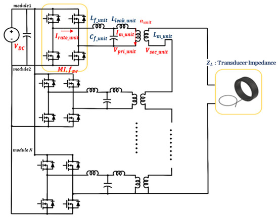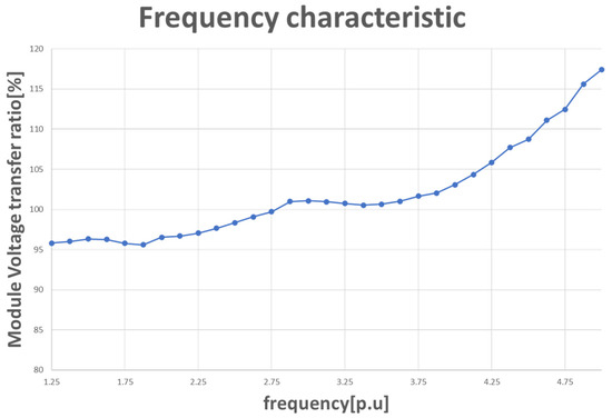 - To minimize changes in the amplifier characteristics with frequency variations, the turn ratio of the transformer was fixed, and the change in voltage gain with respect to the number of modules was adjusted through DC link voltage control using the results of Equation (6).