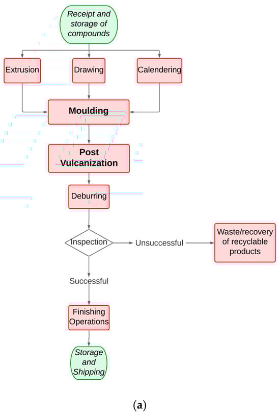 The raw material generally used is the raw compound, which is initially processed through various phases and then undergoes moulding, the most energy-intensive process in the process. In this phase, the vulcanisation of the rubber takes place, i.e., a chemical-physical process at high temperature (about 160 °C to 200 °C) [40] necessary to change the behaviour of the compound from plastic to elastic. Moulding generally takes place by compression, placing the rubber in a special machine and then closing the heated press to give it a specific shape and the desired mechanical properties. Another method is injection moulding, where the rubbery material is initially melted and plasticised and then injected under high pressure into a melt form, after which the material is allowed to solidify into the desired shape. The next phase is called post-vulcanization, the second most intensive, in which the material is heated in an oven to remove the stresses caused by the previous processing. To complete the process, the gasket is first cleaned of burrs formed in the moulding process phase and then undergoes testing and finishing prior to storage and shipment.