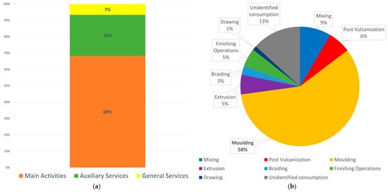 NACE C22.1.9: Gasket manufacturers cluster. (a) Electricity consumption distribution for functional macro-areas; (b) Electricity consumption distribution for main activities. Source: Authors’ elaboration on Microsoft Excel.