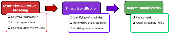 The proposed risk assessment framework comprises three main sections, as shown in Figure 1: (i) cyberphysical system modeling, (ii) threat identification with cyberattack models, and (iii) impact quantification. This framework enables rapid snapshot analysis, focusing on steady-state evaluation. Moreover, due to the integration of the inverter dynamic model, it also facilitates accurate simulation of dynamic behavior, allowing for a detailed exploration of the potential impact of cyberattacks on the physical system. This framework has a modular structure, offering scalability and flexibility to incorporate other modules. Once the system configuration is collected, this framework can be tailored accordingly. It enables the assessment of risks posed by specific attacks and identifies the most vulnerable components in the cyber layer. Consequently, it provides valuable insights for crafting effective defense policies.