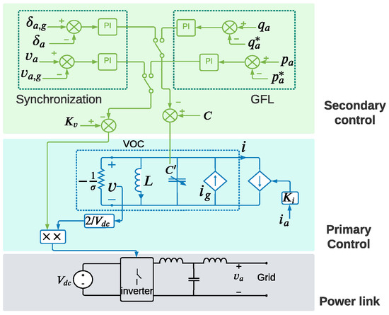 - Awal, M.A.; Yu, H.; Tu, H.; Lukic, S.M.; Husain, I. Hierarchical Control for Virtual Oscillator Based Grid-Connected and Islanded Microgrids. IEEE Trans. Power Electron. 2020, 35, 988–1001. [Google Scholar] [CrossRef]