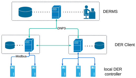 A typical DER communication network [28] is provided in Figure 4. It is a three-layer hierarchical communication network analogous to an SCADA system. The first layer is the DERMS located at the utility control center. The DERMS is responsible for the operational control of all DERs. The second layer consists of DER clients enabling communication with DERMS, as well as the communication among clients for data exchange to enable distributed control. The local controller is the third layer, responsible for collecting field device measurement data and regulating DER output. Generally, this layer only supports local communication.