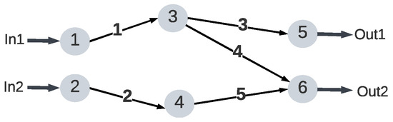 Take Figure 5 as an example to illustrate the modeling process. This communication network comprises six nodes and five links with two input and output streams, respectively. For node 3, the target nodes are nodes 5 and 6, with the node function map as and . Similarly, for node 6, and denote the function corresponding to inputs from node 3 and node 4, respectively. The node function matrix in this system is