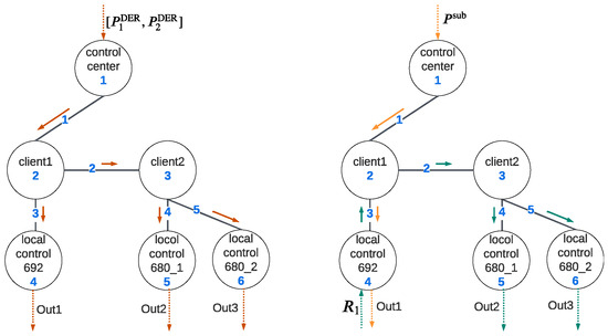 The control command is issued for adjusting the setpoints of DERs. The two DERs at node 680 are considered a unified single unit during the OPF control level. Based on their respective capacities, DER client2 divides and transmits the information to two local controllers, as depicted in Figure 7. Considering the high data processing rate at the control center, the delay time can be disregarded. The communication network parameters are detailed in Table 1, with and representing the processing rate and forwarding rate, respectively. The node function can be characterized as follows: