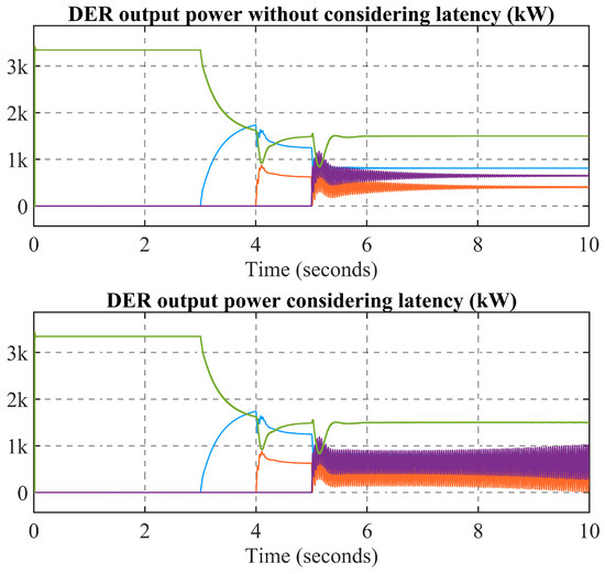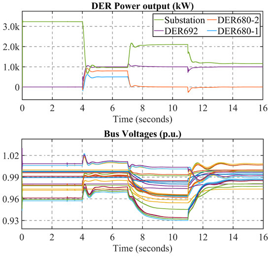 Figure 7 illustrates the data flow in the communication layer. In Algorithm 1, the control center calculates the real and reactive setpoints and sends them to each DER, while in Algorithm 2, DER at node 692 adjusts its power injection to control real and reactive power at PCC, and DERs at node 680 use the power ratio of DER at node 692 as input to achieve load sharing. In the following simulation, cases 1, 2, and 3 deploy Algorithm 1, and Algorithm 2 is implemented in case 4. The system dynamic model is implemented in MATLAB 2022, utilizing a machine with the following configuration: an Intel i7 processor with 16 GB of RAM running at 2.8 GHz.