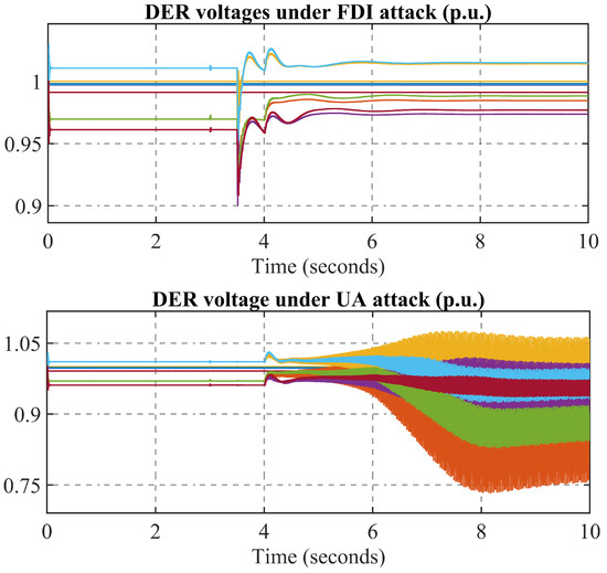 In this case, attackers try to compromise the local controllers and implement an FDI attack. Assuming the DER operation schedule is the same as in Case 1, attackers compromise node 6 at the beginning and start modifying the local voltage measurement data to 1.2 times the original value, i.e., . This will impact the DER synchronization process. Specifically, as the measurement data are altered, maintaining the same control algorithm, the actual voltage of the inverter tends to be approximately 0.83 times that of the voltage on the grid side. Consequently, at 3.5 s, when the inverter connects to the grid, the significant voltage differential, combined with the low inertia of the inverter, induces an inrush current from the grid into the inverter. This results in a substantial voltage drop on the grid side, as depicted in Figure 9. Following the transition to GFL mode, the inverter aligns with the grid-side voltage, restoring the voltage profile to within normal ranges. However, in practical scenarios, this inrush current may surpass the maximum current limit, triggering protective mechanisms and causing a DER trip.
