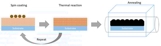 The sol-gel deposition method is a cost-effective and relatively simple technique for synthesizing CZT(S/Se) thin films. The process can be carried out in two steps, starting with the preparation of an aqueous solution containing the sol-gel precursors, followed by spin coating the solution onto the substrate to obtain the desired deposits as presented in Figure 2. This technique is well-developed in the thin film industry due to its reproducibility for large-scale fabrication. However, despite its advantages, very few studies have been conducted on the synthesis of CZT(S/Se) thin films using sol-gel deposition.