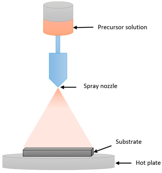 Spray pyrolysis deposition is a widely used technique in thin film production due to its easy process and relatively simple manipulation. This method, thanks to its simplicity and reproducibility, is well-known for its application in large-scale synthesis of thin film semiconductors. One of the most significant advantages of this technique is that it does not require any vacuum steps throughout the process, making it suitable for industrial commercial production. Spray pyrolysis involves atomizing a precursor solution onto a heated substrate. The equipment includes a substrate holder, spray nozzle, heater, and gas delivery system (Figure 3).