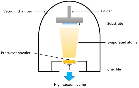 This technique utilizes a vacuum chamber and an evaporation source, typically a heated crucible. In this process, the material is vaporized and deposited onto a substrate placed strategically within the vacuum environment. The substrate may have controlled movement for uniform film deposition (Figure 4). The deposition of CZT(S/Se) films by evaporation can be achieved through two different approaches: single-step deposition [30,31], where all the precursors are simultaneously deposited and then followed by sulfurization, and sequential two-step deposition using different metallic or binary precursors, in different combinations and sequences, such as Cu/Sn/Zn/Cu, Cu/Sn/Cu/Zn [32], Cu-ZnS-Sn [33] or CuSn/Zn/Se/CuSn/Se [34], followed by annealing with a sulfur or selenium source.