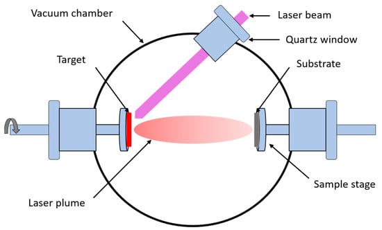 Pulsed Laser Deposition (PLD) remains one of the best methods for producing high-quality CZT(S/Se) thin films with complex compositions. This technique is known for its numerous advantages, such as its simplicity and process flexibility, improved crystallinity, and the ability to obtain clean films owing to the absence of atmospheric gases. The PLD comprises a laser system, target material, vacuum chamber, and a substrate holder. A high-energy laser vaporizes the target, creating a plume that deposits onto a substrate in the vacuum chamber (Figure 5). PLD systems manage deposition rate, temperature, and pressure, often incorporating in situ monitoring tools for real-time analysis. However, the literature shows limited work conducted using this method, despite its significant advantages for CZT(S/Se) thin film deposition.