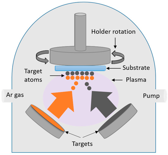 Magnetron sputtering is renowned for its ability to synthesize thin films on extensive substrates [41]. In CZTS synthesis, the system allows for substrate heating during deposition or sulfurization after sputtering [42,43]. It supports diverse targets, including metallic precursors, binary sulfide targets, or single quaternary targets [44]. The choice of direct current (DC) sputtering for elemental conductive targets (Cu, Zn, Sn) and radio frequency (RF) for binary and quaternary targets ensures efficient deposition [45,46]. Magnetron sputtering provides control over chemical composition, film thickness, uniformity, adhesion, and substrate coverage, achieving high deposition rates and purity [47,48]. Challenges such as target poisoning and cracking at high power need consideration [49,50].