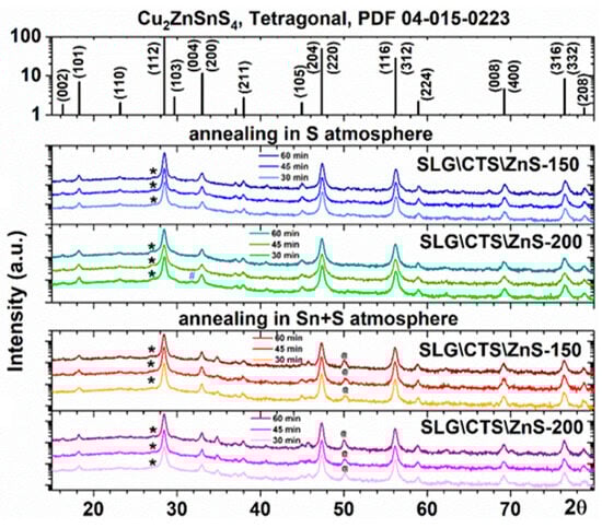 X-ray diffractograms of CZTS films obtained on ZnS layers with two different thicknesses (150 and 200 nm) deposited on top of CTS films and annealed in different atmospheres for different times. The ZnS phase (hexagonal, ICDD 04-012-8144) is indicated with “*”, the CuS phase (hexagonal, ICDD 04-008-8460) is indicated with “#”, and the SnS2 phase (hexagonal, ICDD 00-021-1231) is indicated with “@”. Reproduced with permission [65].