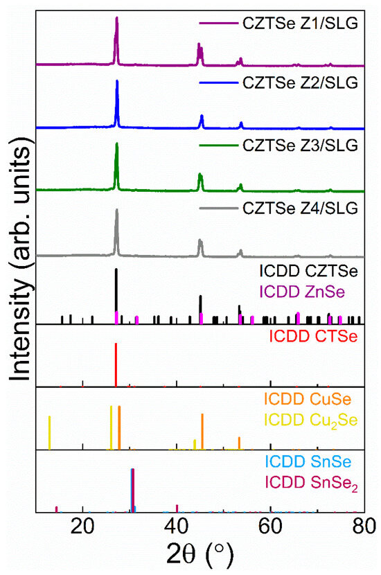 X-ray diffractograms of CZTSe films deposited on SLG using different stacks. Reproduced with permission [69].
