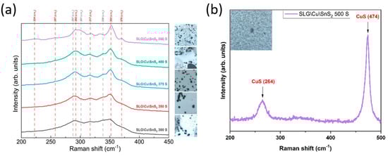 Raman spectra of (a) SLG\SnS2\Cu stacks annealed in S atmosphere at different temperatures and (b) Raman spectra of CuS secondary phase depicted in one of the SLG\SnS2\Cu films annealed at 500 °C. Figures were reproduced with permission [20].