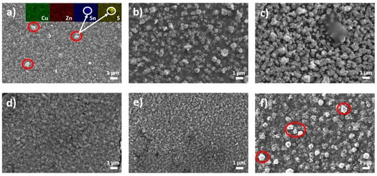 SEM images of the CZTS films from SLG\CTS\ZnS-150 stack annealed in Sn + S atmosphere for (a) 30, (b) 45, and (c) 60 min, respectively; and the SLG\CTS\ZnS-200 stack sulfurized for (d) 30, (e) 45, and (f) 60 min, respectively. The red circles represent grains of the SnS2 secondary phase; the inset shows the SnS2 grains observed by EDS mapping. Reproduced with permission [65].