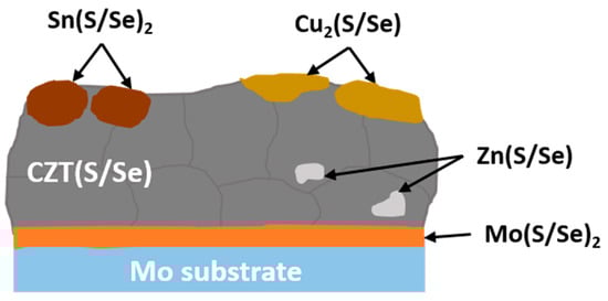 Representation of the distribution and morphology of Cu2(S/Se), Sn(S/Se)2, Zn(S/Se) and Mo(S/Se)2 secondary phases within the CZT(S/Se) film.