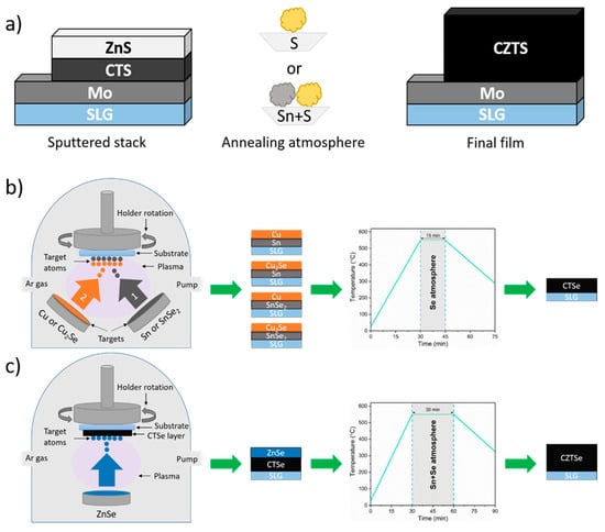 Schematic of the magnetron sputtering deposition and annealing process of (a) the CZTS films (b) the CTSe layer and (c) the CZTSe final films. Reproduced with permission [65,87].