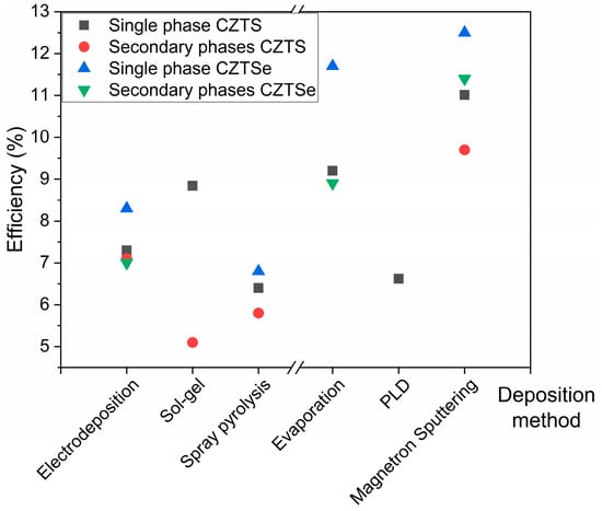 Figure 14 compares the highest efficiencies achieved in solar cells based on CZTS and CZTSe absorber layers deposited by various methods, considering the presence or absence of secondary phases. Among the electrodeposition techniques, CZTS devices reached a peak efficiency of 7.30% in the absence of secondary phases [145], while CZTSe solar cells achieved 8.20% [146]. However, when secondary phases were present, the efficiency slightly decreased to 7.10% for CZTS [118] and 7% for CZTSe [114]. Sol-gel deposition yielded 8.84% efficiency for solar devices based on single-phase CZTS films [147], but only 5.10% when secondary phases were present [148]. In spray pyrolysis, CZTS achieved 6.40% efficiency without secondary phases [149], whereas the CZTSe-based device reached 6.80% [150]. Evaporation techniques resulted in the good efficiencies, with CZTS absorbers reaching 9.20% without secondary phases [151] and CZTSe absorbers achieving 11.70% [152]. However, the presence of secondary phases slightly reduced the efficiency to 8.90% for CZTSe [153]. The CZTS absorber layer deposited by PLD resulted in a device achieving an efficiency of 6.62% [154]. The highest efficiencies were recorded on the devices obtained by magnetron sputtering, particularly for CZTSe films, with efficiencies of 12.50% for single-phase films [155] and 11.40% for films with secondary phases [156]. While for the CZTS material, the efficiency is a bit lower with 11.01% for the single phase-based device [157] and 9.70% in the presence of secondary phases [158].