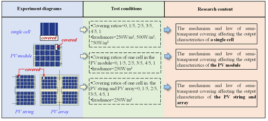 Figure 2 shows the whole research processes in this work. At first, we investigated the mechanism of a semi-transparent covering on the output characteristics of a single cell. The output power and I–V characteristics of the cell were measured under different covering ratios and irradiances, and the relationships between them were analyzed.