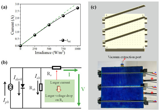 Figure 3a provides the output Isc of an uncovered single cell with irradiance. Although the output Isc of the cell is nearly linear with the irradiance, the degree of deviation from linearity gradually increases with irradiance (Figure 3a). Even with the three-row probe testing process (Figure 3c), it is still difficult to circumvent the series resistance in the measurement circuit. According to Figure 3b, higher irradiance leads to a larger current I, which in turn leads to a greater voltage drop across the series resistance. Thus, a smaller voltage was measured by the I–V meter, affecting the test results (higher irradiance gives smaller FF).