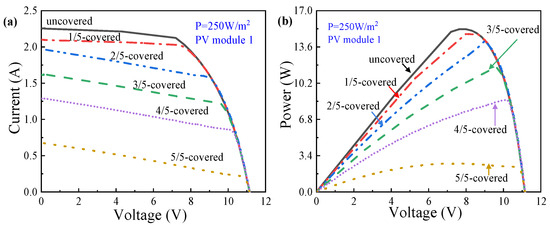 (a) The current–voltage curves of PV module 1, where one cell is covered by various ratios under irradiance of 250 W/m2. (b) The power–voltage curves of PV module 1, where one cell is covered by various ratios under irradiance of 250 W/m2.