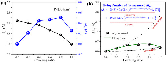 (a) The Isc and ΔIsc of the module with the covering ratio of the covered cell. (b) The fitting curve of the reverse bias current value ΔIsc at 250 W/m2, which is contributed by the covered and uncovered parts.