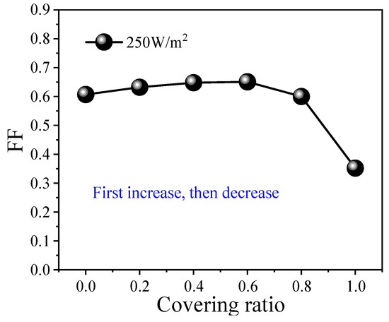 The FF of the module has a complex relationship with the covering ratio, as shown in Figure 6, which tends to increase and then decrease with the covering ratio. The FF of the module changes with the covering ratio because it is affected primarily by the series resistance and the module current. The increased covering ratio leads to a decreased module current. Thus, the voltage drop of the wire resistance (series resistance) of the uncovered cell decreases [proportional to (1 − R)], causing the FF to increase. However, an increased covering ratio leads to a corresponding increase in the charge accumulation at the bi-ends of the covered cells. An increased reverse bias voltage [proportional to R] corresponds to a greater equivalent resistance of the covered cells, causing FF to decrease. When the covering ratio is larger than a certain value, maybe 0.6 for a silicon solar cell, the dominant factor for FF seems to change: the equivalent resistive voltage drop accelerates for the covered cell with an increased covering ratio, resulting in the FF of the module to decrease with the covering ratio. When the cell is fully covered, the “preferred channel” for its reverse bias current (high carrier concentration region that is not covered) disappears. Therein, the module series resistance is the largest, and the FF is the smallest.