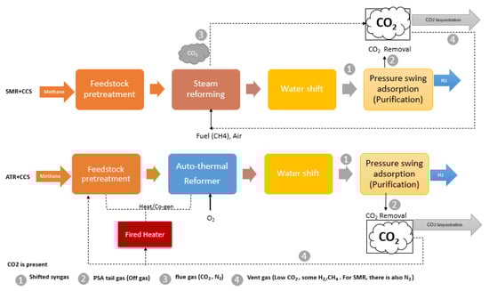 With the emphasis on low-carbon-intensity hydrogen, autothermal reforming (ATR) as a hydrogen production technology has gained more momentum. ATR uses oxygen and steam, allowing for a more thermally efficient process. While complex and with higher capital costs due to the integration of air separation units, ATR systems benefit from reduced flue gas volumes, enhancing the efficiency of CO2 capture [22]. This makes ATR an attractive option for greenfield projects where new facilities are being constructed. Its lower carbon footprint, particularly with high CCS efficiency, is a key advantage and can capture up to 95% of emissions [5,17,18,19,23].