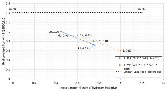 here, the CO2 capture rate is the amount of CO2 captured per kg of hydrogen produced, which helps to estimate the equivalent credit on an H2 basis. By comparing , one can obtain an understanding as to which tax credit scenario provides a higher NPV for the project, while another alternative, which is likely easier to understand, would be to convert the impact on the project value on a levelized cost basis. It would arrive at a dollar amount per kg of hydrogen produced under each tax credit scheme for the same facility.