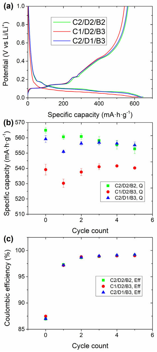 The formation cycle (at 0.05C) of the electrodes with the different fractions of inactive components (i.e., C45, CMC, and SBR) is shown in Figure 1a. Above 0.2 V no defined plateaus were observed for any of the samples. On the contrary, a plateau between 0.4 and 0.5 V could be observed in the delithiation (charge) plateau, attributed to the electrochemical activity of SiOx. In the lithiation step, three well-defined plateaus at 0.18, 0.12, and 0.08 V could be observed for the C2/D2/B2 and the C2/D1/B1 samples, lower than the lithiation steps of graphite (0.17, 0.10, and 0.06 V) [50]. These plateaus correspond to the formation of LiC36, LiC12, and LiC6 in each plateau. The presence of SiOx leads to a delay in the intercalation of Li+ ions in graphite due to the different chemical potentials of these two active materials [51]. Nevertheless, the cells with C1/D2/B3 exhibited higher polarization upon lithiation, reaching earlier to the cut-off potential (0.01 V), and achieving lower lithiation capacity. The lithiation capacities for the C1/D2/B3, C2/D2/B2, and C2/D1/B3 cells were 616 ± 4, 650 ± 1, and 643 ± 3 mAh·g−1, respectively. As already mentioned, the delithiation of SiOx could be observed between 0.4 and 0.5 V of the subsequent charge. Before reaching that potential, three defined plateaus were obtained at 0.1, 0.14, and 0.21 V, corresponding to the delithiation of graphite. The extension of the plateaus associated with the delithiation of graphite was the same for the three samples, while the delithiation capacity ascribed to SiOx was lower for the sample consisting of C1/D2/B3. 540 ± 4, 565 ± 2, and 559 ± 2 mAh·g−1 were obtained with the cells consisting of the C1/D2/B3, C2/D2/B2, and C2/D1/B3 anodes, respectively. Regarding the first-cycle Coulombic efficiencies, the values obtained were 87.5 ± 0.1, 87.0 ± 0.2, and 88.1 ± 0.2%, respectively (Figure 1c). The cells providing the worst first-cycle efficiencies were those with the lowest SBR fraction. This could be associated with a higher degree of mechanical instability towards the volumetric expansion and contraction of SiOx with lower binder content.