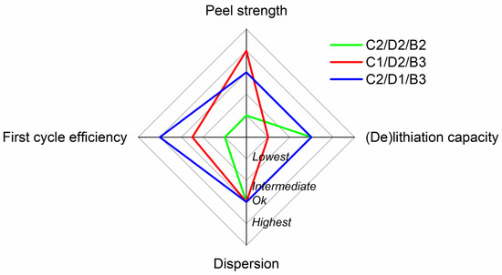 All in all, Table S2 was built up to summarize all the factors studied in this section to facilitate the decision on the inactive component balance to be selected for the next step of the optimization process. The electrochemical performance with C1/D2/B3 was below that of the rest of the formulations due to the polarization observed, and even if the adhesion with this sample was the highest, it was discarded. It is worth noting that an increase in polarization can lead to lithium plating in a two-electrode full-cell format, in which there is no cut-off limit based on the potential of the anode. Thus, the other two electrode formulations were preferred in this regard. On the other hand, the peel strength results with C2/D2/B2 were the lowest, which can make it difficult to manipulate the electrodes if they are upscaled to a semi-industrial scale. Furthermore, the higher content of CMC did not provide an advantage in any of the fields for the C2/D1/B3 formulation. In fact, the first cycle efficiency with 2% SBR was lower, which can be problematic for maintaining the mechanical stability of the electrodes after a significant number of cycles in full-cell format. Also, the coating with C2/D1/B3 provided a good or the best result for all the parameters studied. This was, therefore, the formulation selected for the next optimization stage. To improve the comprehension of these results, they have been summarized in a radar plot in Figure 2.