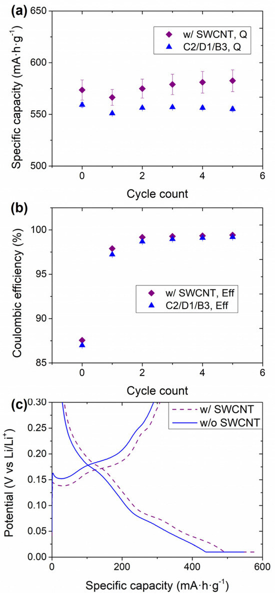 The electrochemical performance of the HCC consisting of the anodes with and without SWCNT is shown in Figure 4. Both the delithiation capacity (Figure 4a) and the Coulombic efficiency (Figure 4b) were increased in the presence of SWCNT. Indeed, the impact on the Coulombic efficiency was not solely observed for the first cycle; it was higher for the five cycles analyzed. For a more detailed analysis of the influence of the SWCNT, the first 0.33C cycle is represented in Figure 4c.