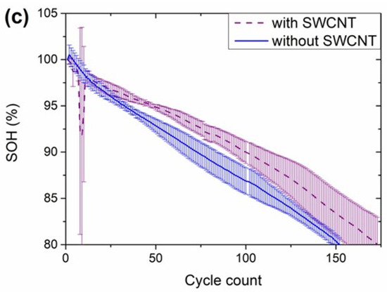 The polarization observed in HCC was evidenced in the first charge in FCC configuration, in which 226 ± 2 and 223 ± 2 mAh·g−1 were obtained with the cells consisting of anodes with and without SWCNT, respectively (Figure 5a). Even if there was no impact on the polarization of the discharge curve, the capacity decreased from 186 ± 2 to 185 ± 2 mAh·g−1 in the absence of SWCNT. These small differences, smaller than in HCC, might be associated with the lower utilization of the anode in FCC; in this configuration, the anode was in excess of 10% with respect to the cathode, while in HCC the anode is more severely pushed to its limits in terms of lithiation and delithiation capacity due to the quasi-infinite lithium inventory. Nevertheless, the main differences in the electrochemical performance were observed in the retention of the capacity upon cycling (Figure 4c and Figure 5b): until the 10th cycle, similar discharge capacities were obtained with both types of anodes. From that cycle, the capacity decay of the cells without SWCNT was steeper than for the cells with nanotubes. It is worth mentioning that the capacity fade for the cells with SWCNT in cycles 10–11 occurred because the potentiostat was stopped for the verification of the testing channels. The cells without SWCNT achieved 151 cycles before reaching 80% SOH, defined as the end of life (EOL), while 174 cycles were achieved with anodes consisting of SWCNT. As the low mechanical stability of the anodes, leading to the pulverization and loss of electrical contact of Si-based materials is one of the main degradation routes for Si-based anodes (together with the loss of cyclable lithium for the continuous build-up of the SEI layer), the results obtained in FCC are indicative of an improved mechanical stability of the electrodes due to the presence of a nanotube network. The anode recipe upscale, therefore, included SWCNT in the formulation.