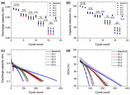The performance in terms of capacity retention was not the same as observed in the rate capability tests. At the beginning of life, the capacity with all the electrolytes was very similar (Figure 6c); as expected, the capacity was higher in the cycles at 0.33C (one cycle at this current every 10 cycles) than in the cycles at 1C. The cycles at 0.33C were used to calculate the state of health (SOH) of the cells. There were two distinctive trends for the capacity retention curves (Figure 6d). On the one hand, the electrolytes providing the lowest capacity retention (EL3, EL4, and EL5) had initially a gradual capacity drop, but the capacity fade was stripped after a certain cycle. On the other hand, the cells with the electrolytes achieving the highest capacity retention (EL1, EL2, and Baseline) had a more linear drop of capacity with the number of cycles. A closer look at the evolution of the SOH with electrolytes EL1 and Baseline, however, shows that the capacity fade was slightly accelerated after ~125 cycles. The capacity retention of the cells with the different electrolytes is well aligned with the FEC content of the electrolytes (Table 2). The cells with the lowest capacity retention were those with less than 5% FEC. A direct comparison between EL3 (128 cycles above 80% SOH) and EL4 (138 cycles) shows that the replacement of 50% LiPF6 by LiFSI did not significantly impact the cycle life of the cells. On the other hand, the cells with 10% FEC (EL1 and Baseline) provided almost the same number of cycles (258 and 248 cycles, respectively) before dropping below 80% SOH. As EL1 was a reproduction of the Baseline electrolyte, the results are coherent. Finally, the cells with EL2 achieved 368 cycles. In this electrolyte, FEC was not considered a simple additive by E-Lyte Innovation due to its high concentration. The cycling performance of these cells can compete with that reported by Wand et al. using a similar anode formulation [53]. In a later work, they obtained a higher capacity retention using less SiOx [36] but these cells consisted of anodes with lower specific capacity (450 mA·h·g−1, while it was 500 mA·h·g−1 in the anodes developed in this work).